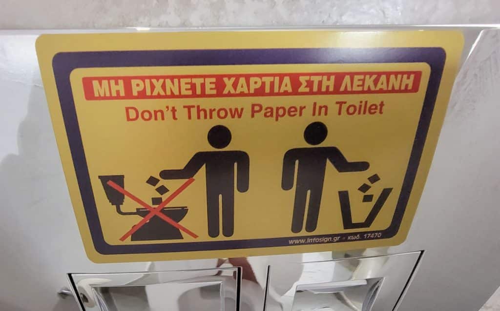 The party line on this is that Greek sewage pipes are 2″ in diameter while the rest of the Western world enjoys the luxury of 4″ pipes. Just about every Greek toilet has a sign instructing you not to place any paper in the toilet.