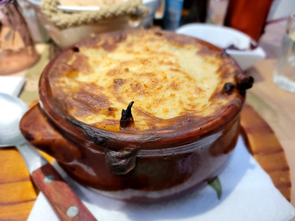 Moussaka – The classic Greek dish is oven-baked with eggplant, potato, and a savory layer of bechamel on top.