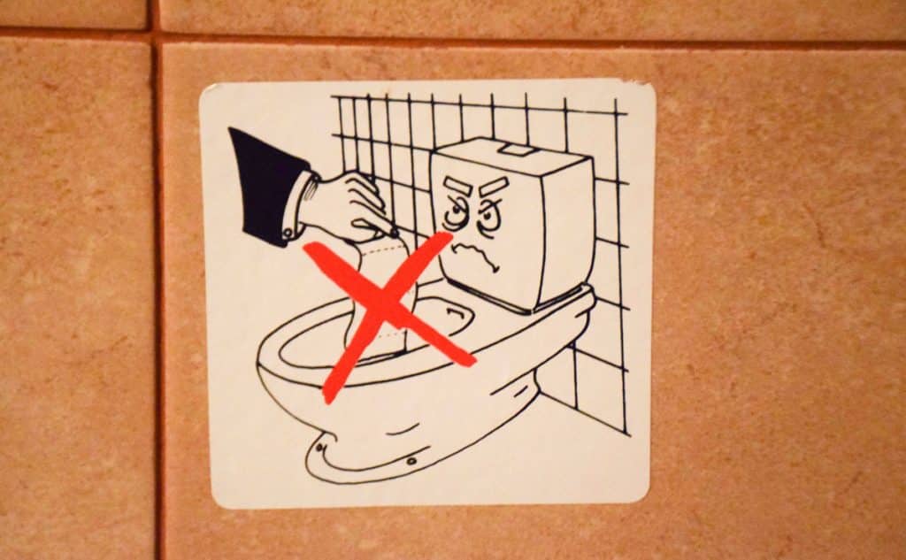 The party line on this is that Greek sewage pipes are 2″ in diameter while the rest of the Western world enjoys the luxury of 4″ pipes. Just about every Greek toilet has a sign instructing you not to place any paper in the toilet.